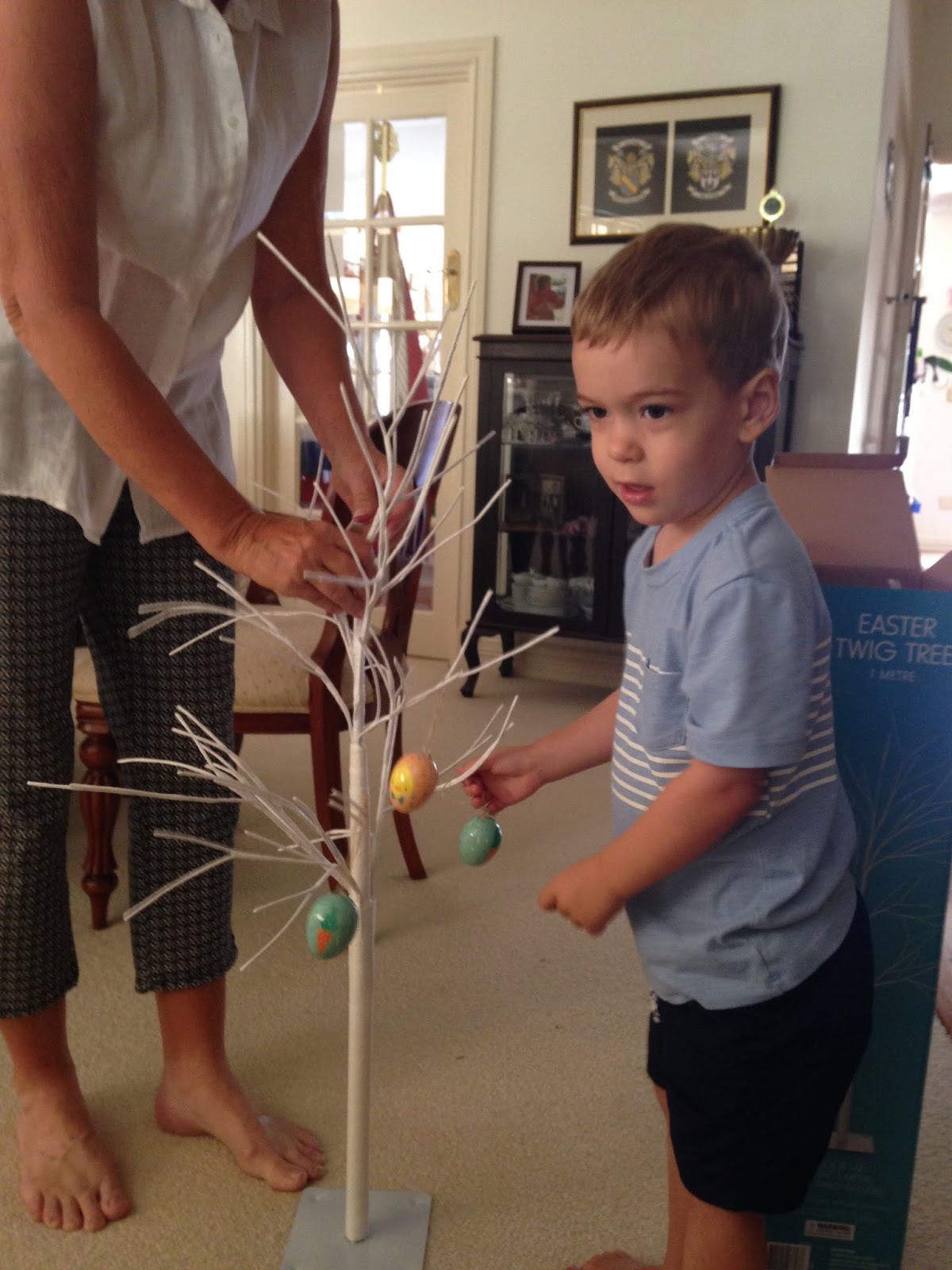 To take the piss out of Ma Ma's obsession with Christmas we bought her an 'Easter' twig tree and some egg decorations. You had fun decorating the 'tree' and we'll no doubt add to the decorations every year from here on in.